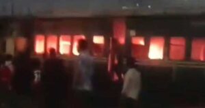 সামাজিক যোগাযোগ মাধ্যমে ছড়িয়ে পড়া একটি ভিডিওতে দেখা যায়, দাঁড়িয়ে থাকা একটি ট্রেনের খালি বগিতে আগুন জ্বলছে।