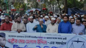 বাংলাদেশ জামায়াতে ইসলামীর কেন্দ্রীয় কর্মপরিষদ সদস্য ও ঢাকা মহানগরী দক্ষিণের নায়েবে আমীর, ঢাকা-৮ আসনে জামায়াত মনোনীত সংসদ সদস্য প্রার্থী এডভোকেট ড. হেলাল উদ্দিন বলেছেন, জাতীয় নির্বাচনকে অর্থবহ করতে আগে গণভোট প্রয়োজন। তিনি বলেন, জুলাই সনদে রাজনৈতিক দলগুলোর স্বাক্ষরের মাধ্যমেই জুলাই সনদে রাজনৈতিক দলের সম্মতি চলে আসছে। সবশেষ রাষ্ট্রপতি কর্তৃক জুলাই সনদের আদেশ জারি করার মাধ্যমে নতুন বাংলাদেশ বিনির্মাণের পথ তৈরি হয়েছে। কিন্তু গণভোট আয়োজনে গণমানুষের দাবি উপেক্ষিত হয়েছে। একই দিনে গণভোট ও জাতীয় নির্বাচনের সরকারের সিদ্ধান্ত পুর্নবিবেচনার আহ্বান জানিয়ে ড. হেলাল উদ্দিন বলেন, অর্থ সাশ্রয়ের নামে জাতির ভবিষ্যৎ নির্ধারণে গণভোটকে প্রশ্নবিদ্ধ করা যাবে না। জাতীয় নির্বাচনে কোনো কেন্দ্রে সংঘর্ষ হলে ঐ আসনের পুরো নির্বাচন বাতিল করার ইখতেহার কমিশনের রয়েছে। এক্ষেত্রে গণভোটও বাতিল করতে হবে। এতে অর্থ সাশ্রয় হবে না বরং এক কাজে দুইবার অর্থ খরচ হবে। কারণ একবার ভোট বাতিল করে আবার ভোট আয়োজন করতে গেলে ডাবল অর্থ খরচ হবে। শনিবার (১৫ নভেম্বর) বিকেলে বাংলাদেশ জামায়াতে ইসলামী শাহজাহানপুর থানার উদ্যোগে আয়োজিত প্রচার মিছিল পূর্বক পথসভায় প্রধান অতিথির বক্তব্যে তিনি এসব কথা বলেন।