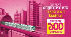 বর্তমানে মেট্রোরেলে দুই ধরনের কার্ড ব্যবহৃত হচ্ছে – র্যাপিড ও এমআরটি পাস। নতুন ব্যবস্থায় দুই ধরনের কার্ডই বিকাশ-এর মাধ্যমে রিচার্জ করা যাবে। আর, ৩১ ডিসেম্বর ২০২৫ পর্যন্ত মেট্রোরেলের কার্ডের রিচার্জ বিকাশ করলেই গ্রাহকরা পাচ্ছেন ৫% করে ক্যাশব্যাক। দিনে ১ বার এবং অফার চলাকালীন সর্বোচ্চ ২ বারে ১০০ টাকা পর্যন্ত ক্যাশব্যাক পাচ্ছেন গ্রাহকরা।